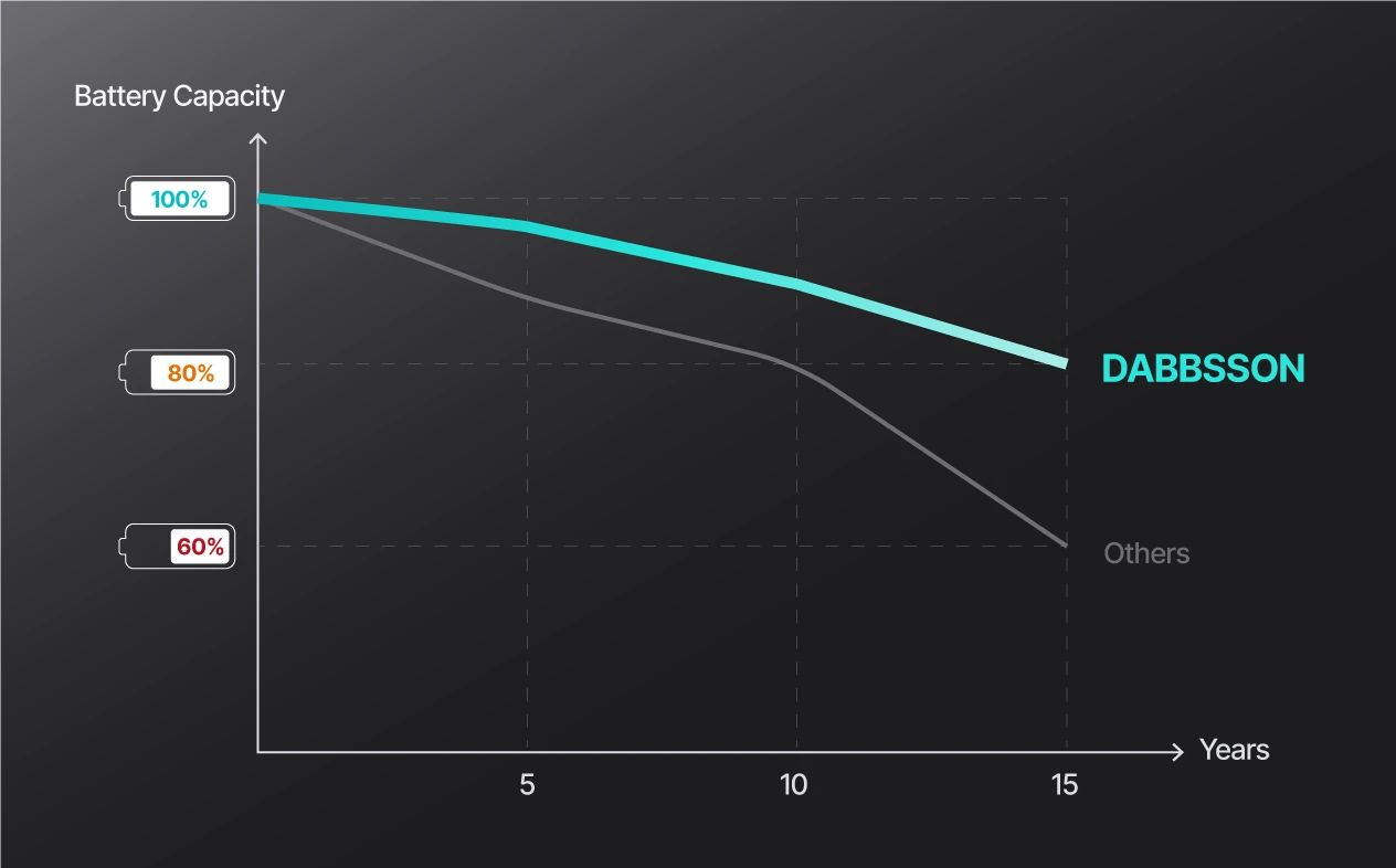 頻繁な交換することはなし。高品質の部品で作られたDabbssonバッテリーは、最大4500回の充電サイクルを実現し、15年後でも80%のバッテリー容量を保つことができます。Dabbssonバッテリーは、時の試練に真に耐えます!